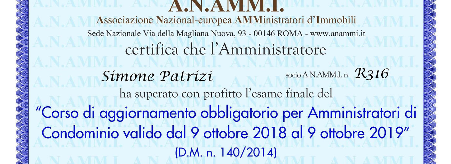 Sono Amministratore Professionista, iscritto con n° R316 all’Albo nazionale A.N.AMM.I, Associazione Nazional-europea Amministratori d’Immobili, recentemente inserita nell’ elenco delle Associazioni rappresentative di categoria a livello nazionale partecipando ai corsi di aggiornamento presso l’A.N.AMM.I.